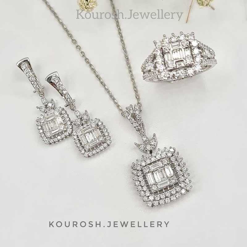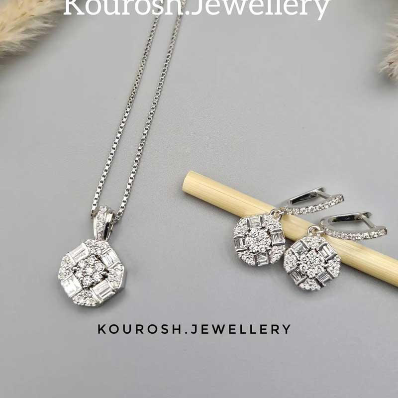 این نیم ست با استفاده از طلای 18 عیار و برلیان سفید و پاک ساخته میشود.الماس های سفید و پاک استفاده شده در این نیم ست از بهترین الماس های موجود در بازار ایران است و همین سفید و پاک بودن الماس ها باعث میشود تا زیبایی آن دو چندان گردد